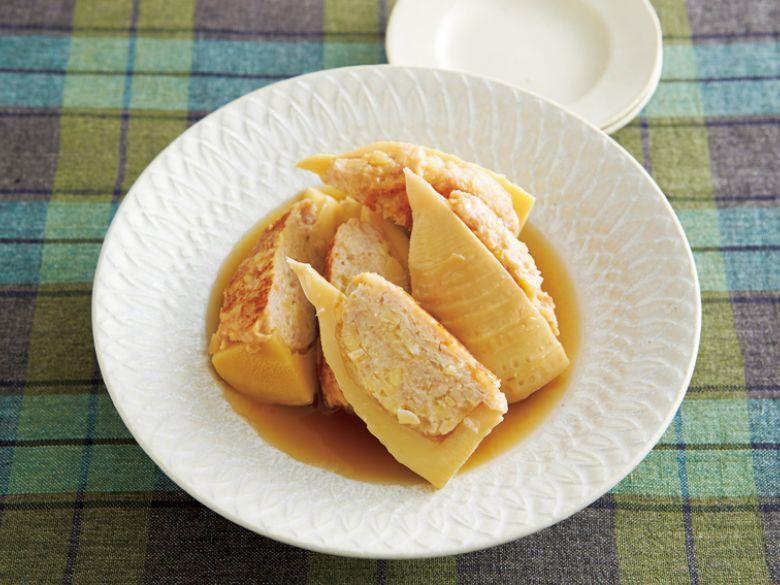 Step 1竹筍的準備作業:竹筍縱向對切。放進滿滿的熱水裡,煮滾後轉中小火,再煮約5分鐘,中途要經常攪拌,瀝乾水分。稍微變涼後,使用湯匙挖出竹筍肉,周邊保留約0.5公分厚度。挖出的竹筍切碎。