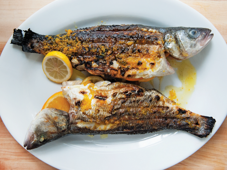 Step 4磨下1顆檸檬和1顆柳橙的皮,擠1顆檸檬汁。柳橙皮屑和果汁混合均勻,剩下的檸檬和柳橙切成0.5公分厚的圓圈狀,和羅勒葉一起塞進魚肚。果皮汁加入2大匙橄欖油,攪拌均勻後讓皮屑沉到底部。