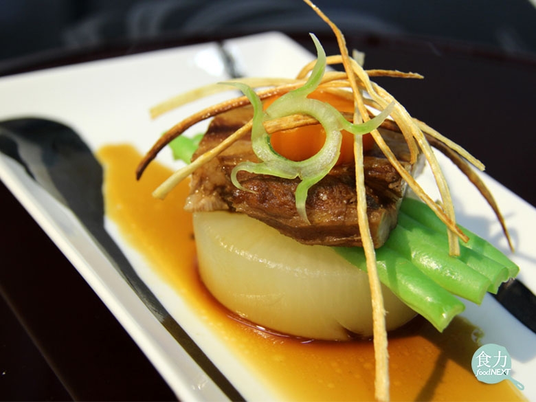 Step 5熱水川燙青菜四季豆後,煎烤後的牛蒡,以及燉煮的白蘿蔔、紅蘿蔔以及香草豬盛盤。