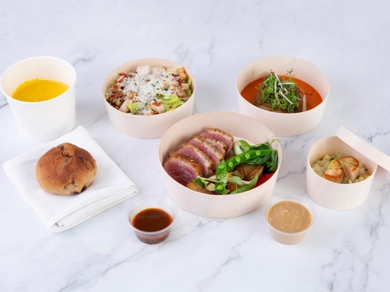 「主廚推薦套餐」外帶自取從湯品、麵包、沙拉、前菜,再到主餐,道道都精心設計調理,同時套餐還提供主菜三選一的選項,有究好豬豬肩胛、熟成10日胭脂鴨,以及美國頂級肋眼牛排,搭配著北海道扇貝櫛瓜燉飯、市場鮮魚番茄酸豆汁、有機南瓜湯、酒釀桂圓麵包,呈現經典法式精緻與整體感。