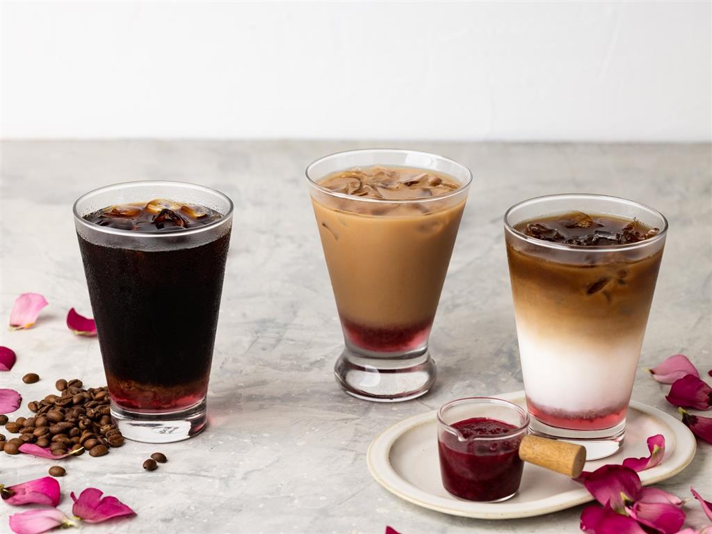 「黑玫瑰氣泡咖啡」則是黑咖啡、有機玫瑰花醬搭上氣泡水迸出的夢幻漸層咖啡,細膩玫瑰花香,不但凸顯咖啡的純粹,混合氣泡綿密的口感,更能享受清新爽口的獨特韻味。