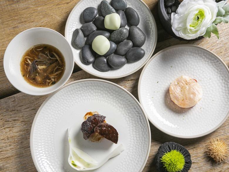 對於白色特別鍾愛的主廚Constant Cheung張卓智,運用「Gordon Ramsay by Royal Doulton主廚聯名系列」暖調象牙白做為餐桌料理上的主色,他認為白色是最能代表冬季的色系,利用豐富的料理色彩與餐瓷顏色達到完美的平衡,進而讓饕客享受視覺、味覺感動人心的美味珍饌。開胃冷前菜「石頭」,運用菠菜、海鮮高湯、牛奶、醃製過的干貝等元素製成一顆可以吃的綠色石頭,軟綿口感驚豔眾人!以趣味美食打開分子料理的無限創意,同時也藉由菠菜綠與象牙白平盤呈現視覺上的擺盤藝術。