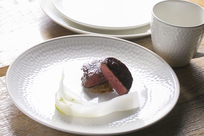 除了視覺及味蕾上的對比趣味,主廚Constant Cheung張卓智於此季料理菜單也特別以「軟辣」的舒服香氣為主軸,呈現嗅覺、味覺上的溫潤鮮香,其中一道「蕃茄/綠咖哩/櫻花蝦」藉由綠咖哩的香辣口感,佐以鮮蝦烤餅,提升此道佳餚的鮮味層次口感。「蘑菇/蘑菇」則採精選巴西蘑菇搭配金針菇等各種菇類精華所熬製成的高湯,盛裝在擁有手感溫度的典雅白餐碗,端出最具深度的濃情湯頭。主餐部分的「菲力牛排/優格醬」也特別使用Royal Doulton主廚聯名系列中的細緻圓盤線條於擺盤上做出創意變化,圓潤的牛排形狀配上主廚特別設計白蘿蔔包覆優格醬,使整道菜色視覺上有了「聚焦」意象。