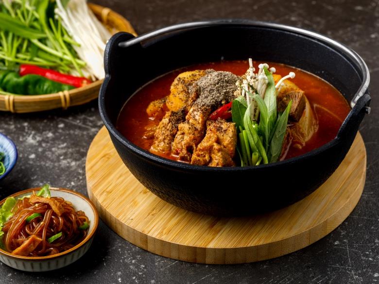 2022年12月8日至12月31日於「八色烤肉」台北忠孝店或台中中友店,點購任一套餐再加88元,就可以加購期間限定的「弘大超人氣馬鈴薯排骨鍋」。(圖片來源:八色烤肉提供)