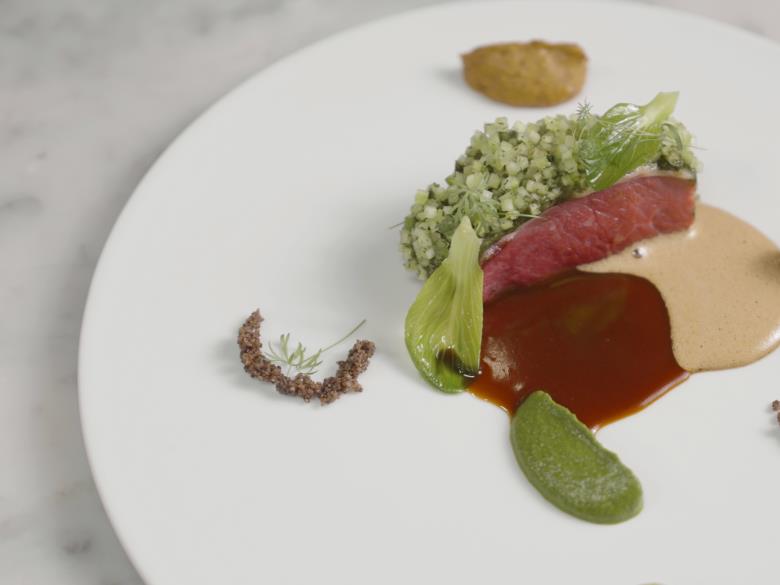 JL Studio主廚林恬耀分享,Nespresso珍稀秘境系列—尼泊爾藍榮城咖啡品飲時帶有烘烤麵包香氣與絲滑香醇特色,因此分別以濃縮咖啡(Espresso)、大杯咖啡(Lungo)不同萃取方式製成兩款風味醬汁,並以此款咖啡搭配香料醃製羊肉。此外,為讓咖啡以多種方式為餐點畫龍點睛,也將咖啡製成coffee crumble,並仿造尼泊爾的沙丘地形呈現於餐盤中。另外,餐點中的蔬菜泥精選自與Nespresso合作「咖啡渣推廣計畫」的桃園青農產地,是此道尼泊爾料理中另一大特色。