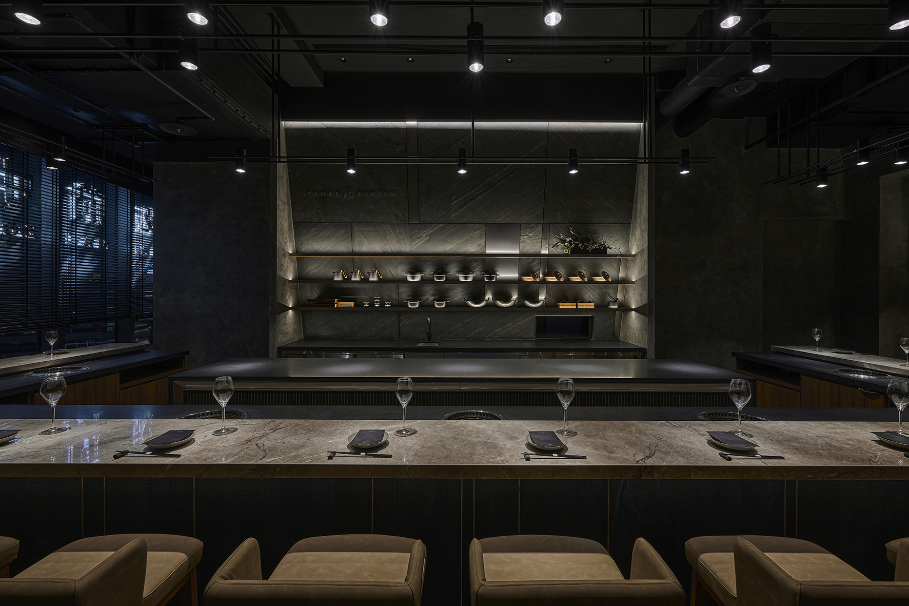 「板前中山ITAMAE ZONZEN」特別將客席設計成板前座位區、桌席座位區,及包廂席位區,共3個區塊。採ㄇ字型的「板前座位區」,一共是16個席位,以斑駁的大理石桌面打亮整體空間,搭配嵌入自日本進口的烤爐,顧客可以一邊欣賞中島料理台上廚師備料的過程、一邊感受燒肉在面前滋滋作響、細心照料的燒烤料理秀。穿過大片落地窗景後來到「包廂座位區」,可容納8人的包廂,以具有穿透感的玻璃格柵區隔,讓喜歡獨立空間、同時想融入現場氛圍的顧客可以享受其中。而走道的盡頭,設置6席「桌席座位區」,每個席位可容納4~6人,提供家庭、聚會聊天氛圍的顧客,舒適寬敞的用餐空間。透過場域之間的關聯與切割,帶出有別於一般燒肉餐廳的舒適環境。