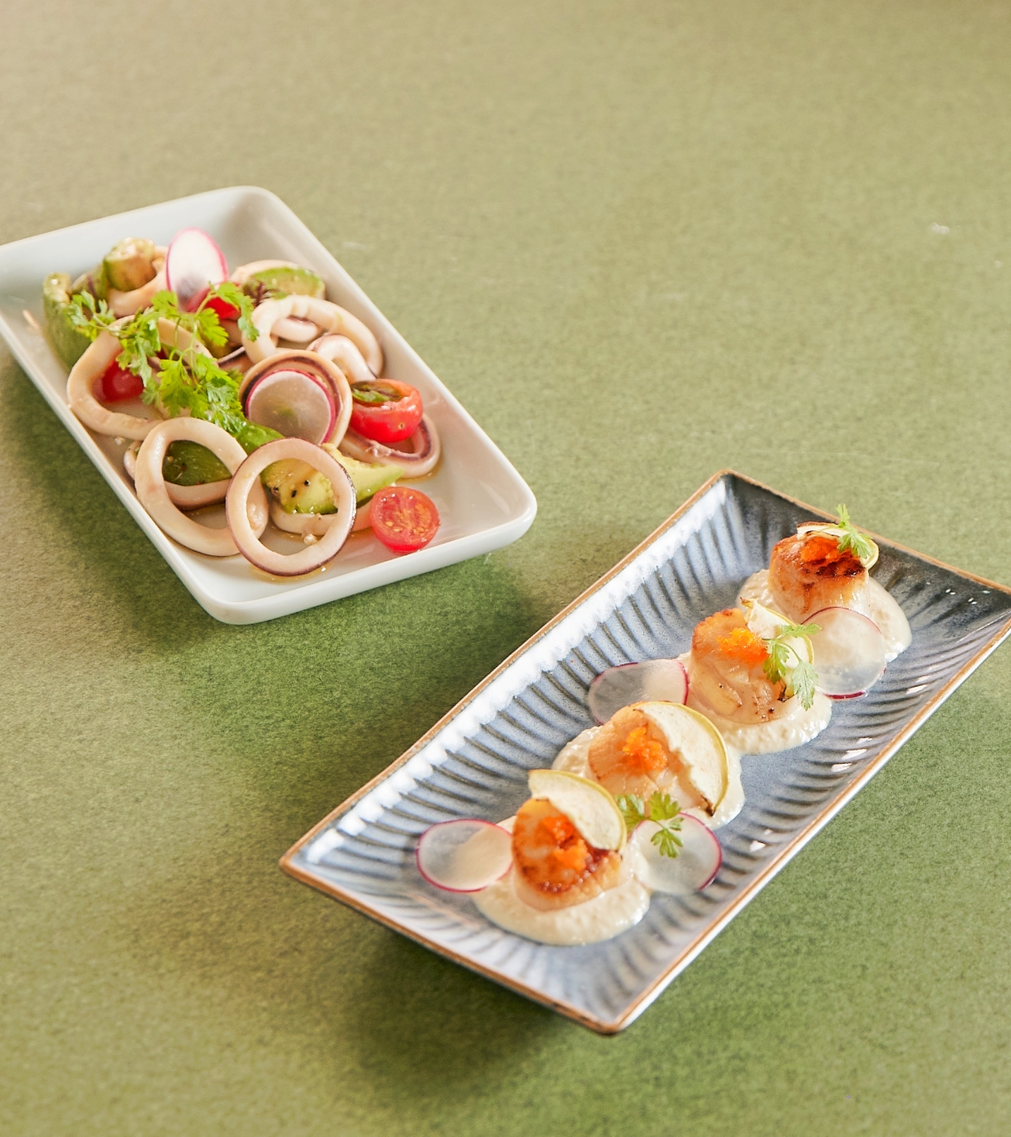 TOK「酪梨醋釀中卷」和「香煎干貝佐青蘋果乳酪醬」。(圖片來源:TOK盡興食光提供)