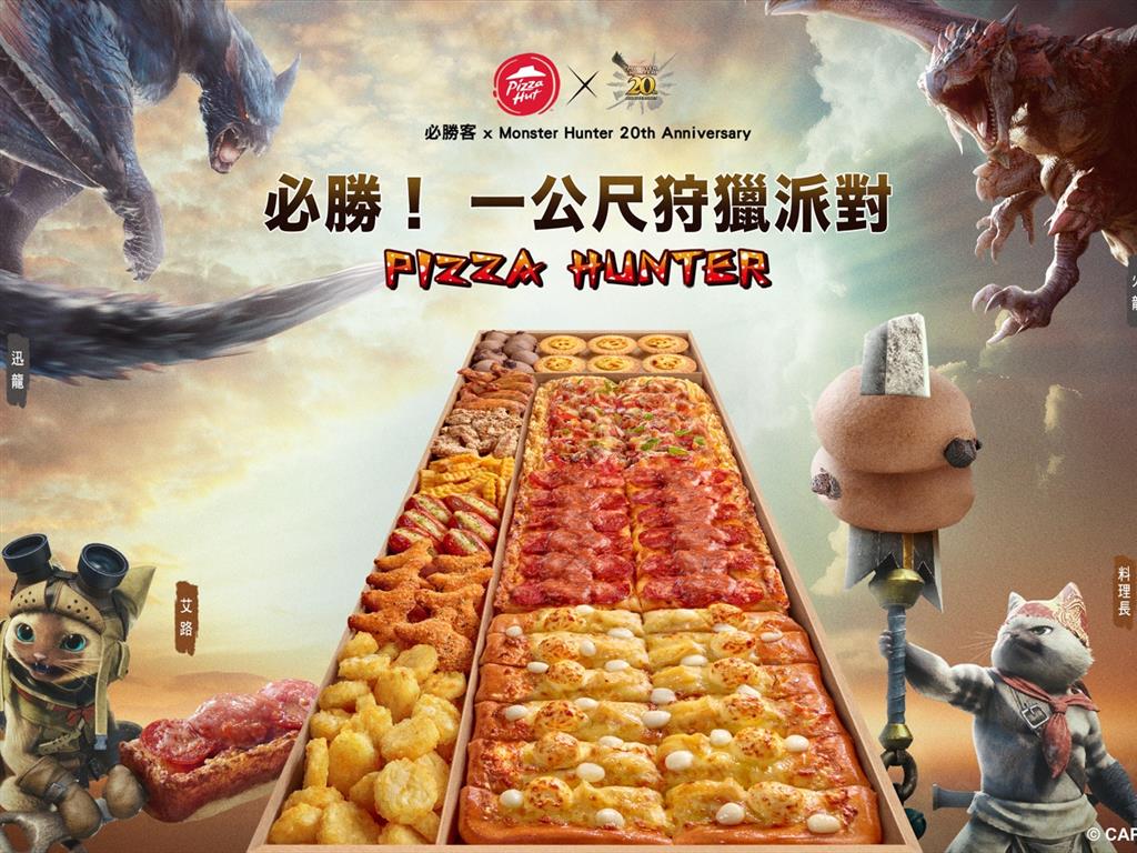 必勝客經典狩獵動作遊戲「魔物獵人」聯名合作,推出「必勝客集會所任務」狩獵派對和多樣精美周邊。多人派對神器「一公尺派對盒」也改版,加入半熟起司塔、波浪地瓜薯條、黃金雞軟骨多款人氣副食和甜點。全新「一公尺派對盒」更獨家附贈魔物獵人聯名限定腰封、經典魔物DIY立體紙雕。