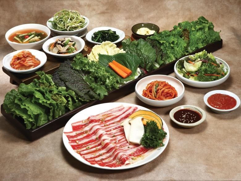 「本家BORNGA韓式燒肉」的另一知名特色為「豪華豐盛生菜盤」,在韓國,吃燒肉搭配生菜帶有包著財富帶來好運的意象,是韓國傳統飲食文化之一,因此本家提供特色新鮮菜盤,時令鮮蔬多達5種,選擇豐富讓顧客能依個人偏好組合搭配。將烤好的肉片加上1~3種生菜與「本家特製海鮮包醬」一同享用,是品嚐本家風味的獨有吃法,大口咬下,牛五花的鮮美、醬汁的香氣與蔬菜的爽口同時在口腔交融,色、香、味俱全,口感與味蕾都滿足,正宗韓式美味這樣吃才過癮。