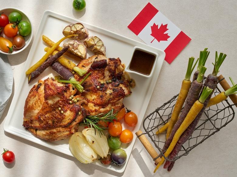 加拿大目前為世界第五大農產品出口國,其中豆類產量銷售額居世界領先地位,豌豆和扁豆更是全球之冠。Quentin主廚帶來的「加拿大魁北克式培根豌豆湯」,使用加拿大豌豆熬煮,濃郁的口感嚐得到培根及豆香味。另外主廚特別推薦「三姊妹沙拉」,所謂三姊妹是指美洲原住民將玉米、豆類及南瓜種植在一起,因生長時彼此互相依附的特性而如此命名,沙拉中除了可品嘗到三姊妹外,另添加了加拿大野米,被譽為穀物中的魚子醬,再拌入生菜與蔓越莓乾,淋上調味的蘋果醋醬汁,風味清爽酸甜。Quentin主廚特別推薦「加拿大魁北克楓糖火烤雞肉/烤紅蘿蔔」,將帶皮雞胸肉加入百里香、迷迭香、楓糖漿醃製後爐烤,邊烤邊塗抹加拿大楓糖漿增添風味,香烤二十分鐘即可上桌,肉質鮮嫩且帶有楓糖香味。