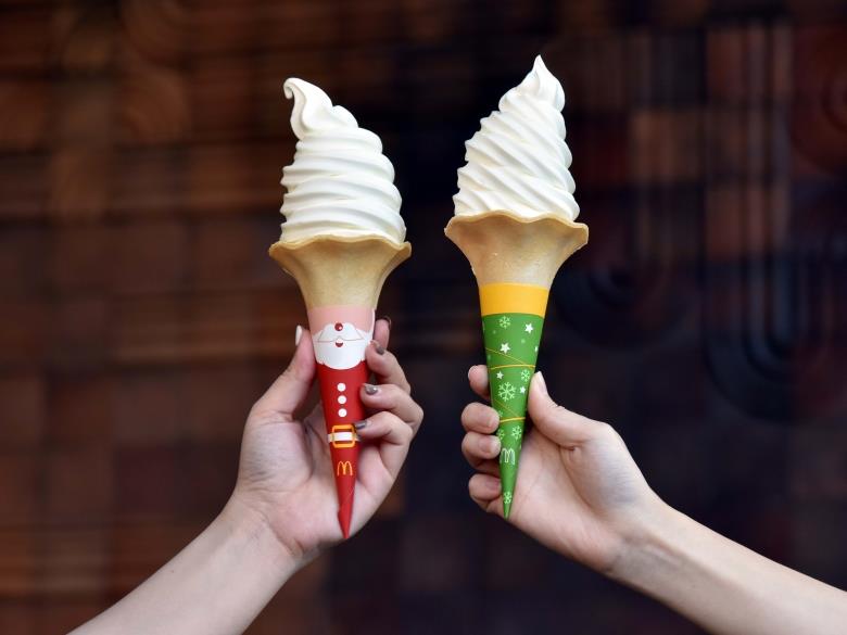 自2020年12月2日起,麥當勞經典的「大蛋捲冰淇淋」首次換上超可愛的聖誕新裝,一次推出2款期間限定的包裝紙造型:俏皮的聖誕老人與繽紛聖誕樹,萌萌的聖誔包裝陪伴顧客歡渡佳節。