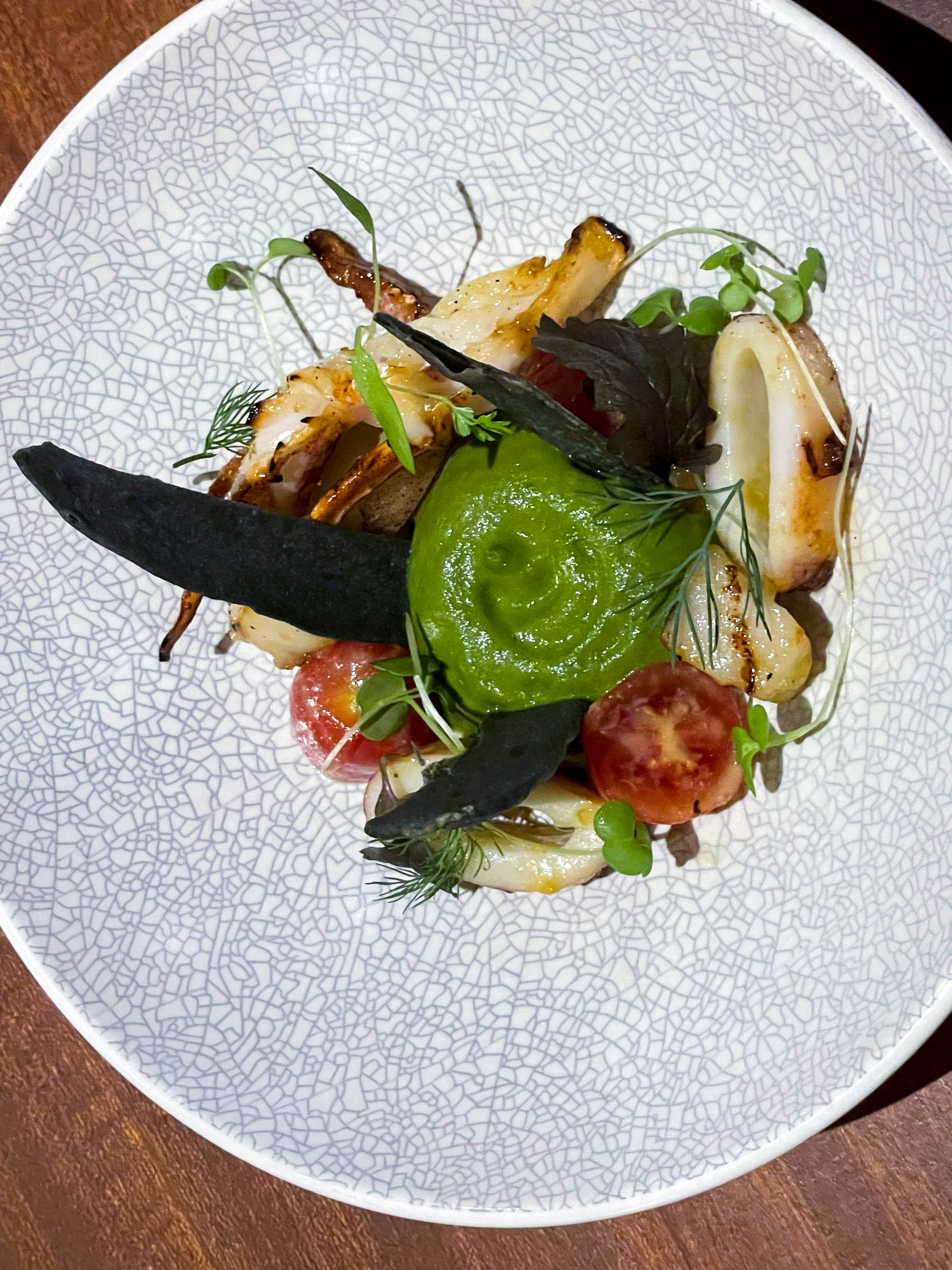 選用新鮮小卷以及北海道生食級干貝,拌入古早味米麴充分咀嚼以豐富炭烤小捲的香氣。另外附上宜蘭名產竹炭牛舌餅搭配番茄與清香羅勒慕斯一起食用十分開胃。(圖片來源:了了礁溪提供)