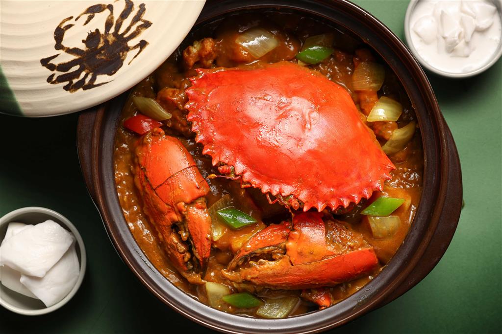 主廚特別選用重達1公斤以上、肉質厚實的斯里蘭卡沙公,將蟹洗淨後用過油輕炸以鎖住肉質的鮮甜,鄔主廚使用了油咖哩、印度咖哩、咖哩粉3種咖哩調和,並加入以洋蔥、乾蔥、紅蔥及自製辣椒粉耗時熬製而成的咖哩膽,與經過油炸後的斯里蘭卡蟹一同爆香燴炒,除了保有老香港傳統風味外、更將味覺體驗帶入不同層次,其中的油咖哩是以植物油為底,搭配薑黃、鹽、辣椒、洋葱、八角、桂皮等香料悉心拌炒而成,整體風味醇厚且層次豐富。入口可同時感受咖哩香、蟹香及米香三重滋味,料理上桌後,服務人員會於桌邊淋上獨門椰漿,為整道菜注入充滿懷舊的港式靈魂。