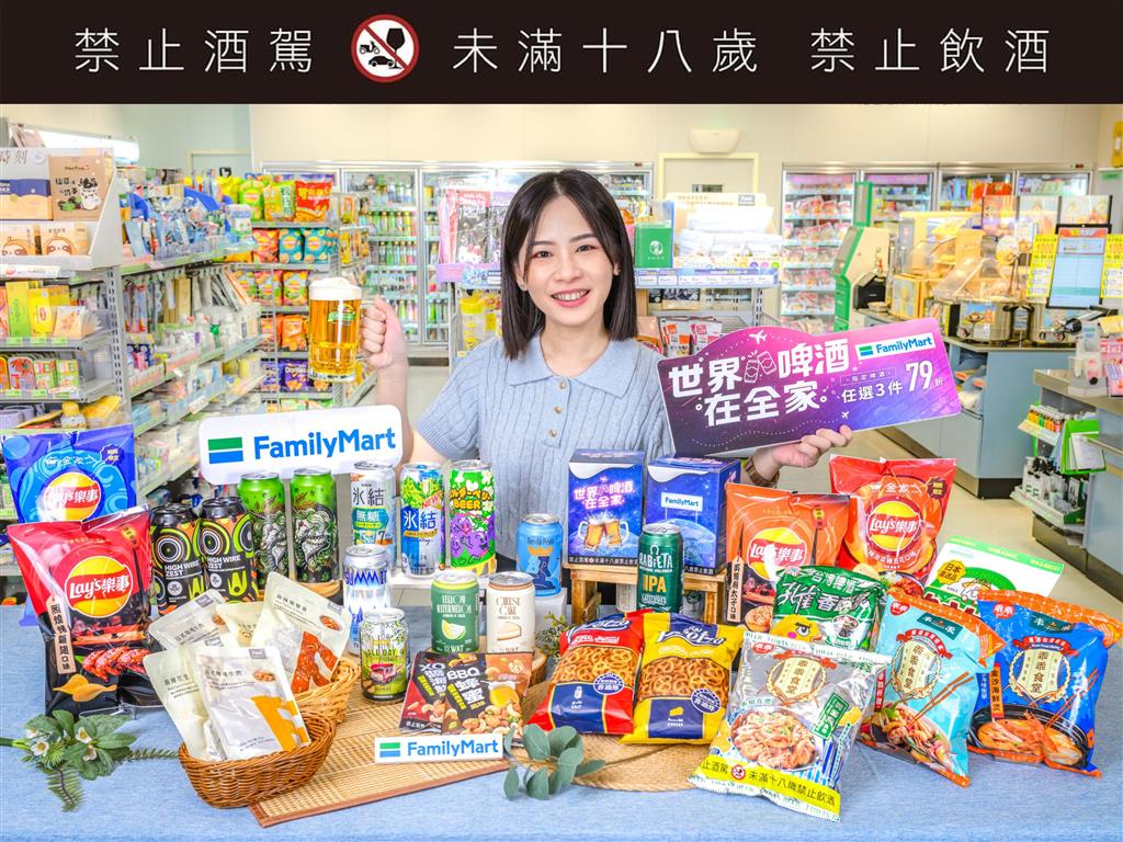 全家2024年6月18日起推出「世界啤酒在全家」活動,2024年7月9日前購買指定啤酒享3件79折優惠。另外配酒必備的下酒菜,媽媽煮藝、FamiCollection袋裝食品,還能以半價優惠加購。全家更獨賣多款居酒屋零食,像樂事與金家ㄟ聯名的「麻油雪蟹蟹膏口味」及「辣泡菜豬五花口味」洋芋片,還有乖乖與台灣啤酒聯名「啤酒蝦」及「啤酒蛤蜊」口味。