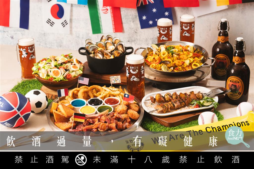 金色三麥更特別推出兩道觀賽美食:「啤酒醬烤松阪豬」烤肉串,還有別出心裁的「冠軍大拼盤」重磅登場!「冠軍大拼盤」以藍莓白巧克力醬、法式黃芥末、墨魚美乃滋、薄荷醬、番茄醬設計五色沾醬,搭配法式吐司、烤脆皮豬腳、酥炸洋蔥圈、酥脆鮮蝦球、現炸薯條,五環殿堂級的色香味,只在賽事期間限定供應!