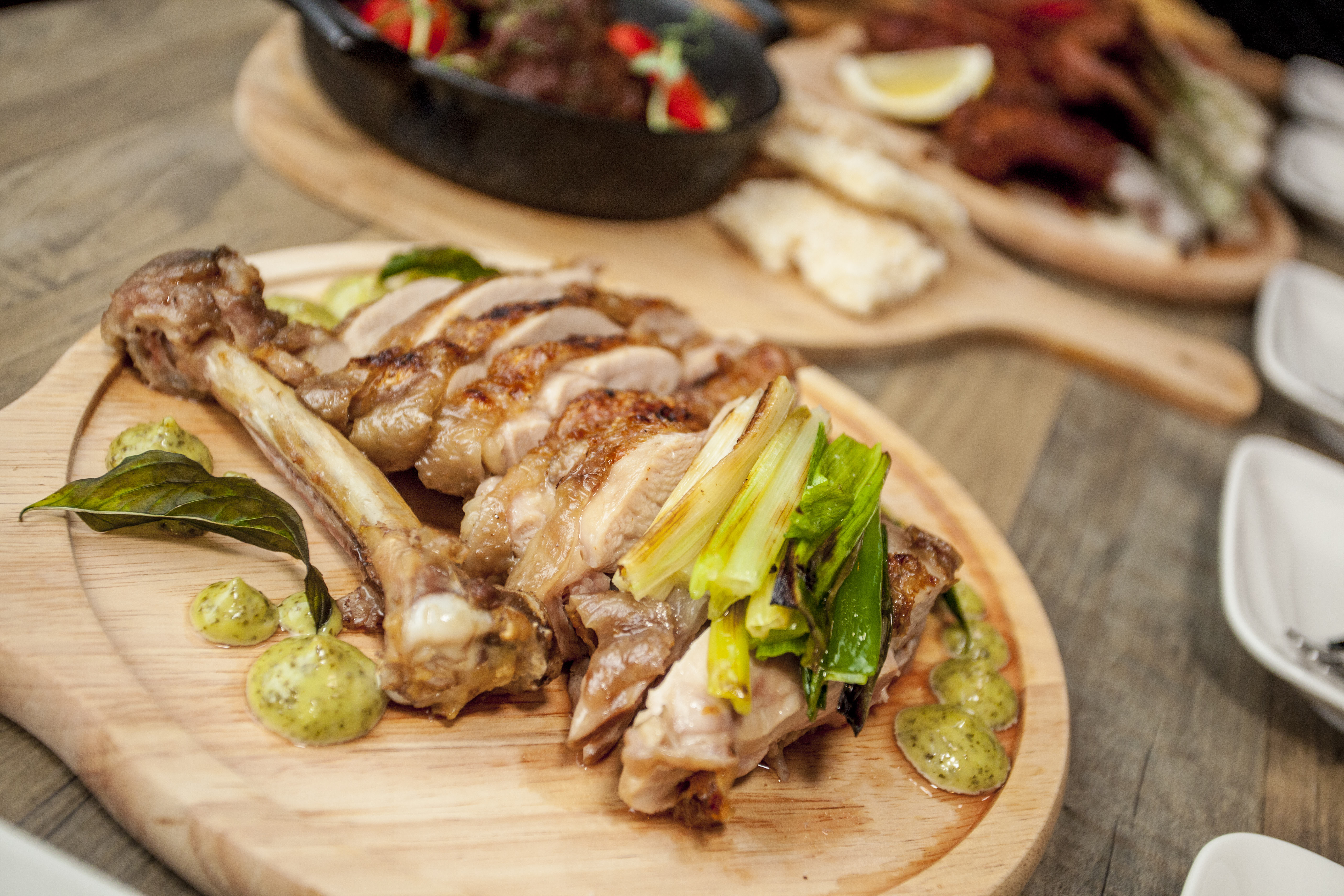 鹽烤放山雞腿配青醬美乃滋,使用宜蘭的三星蔥及自製青醬美乃滋,搭配外皮酥脆放山雞腿。(圖片來源:BOX Taipei提供)