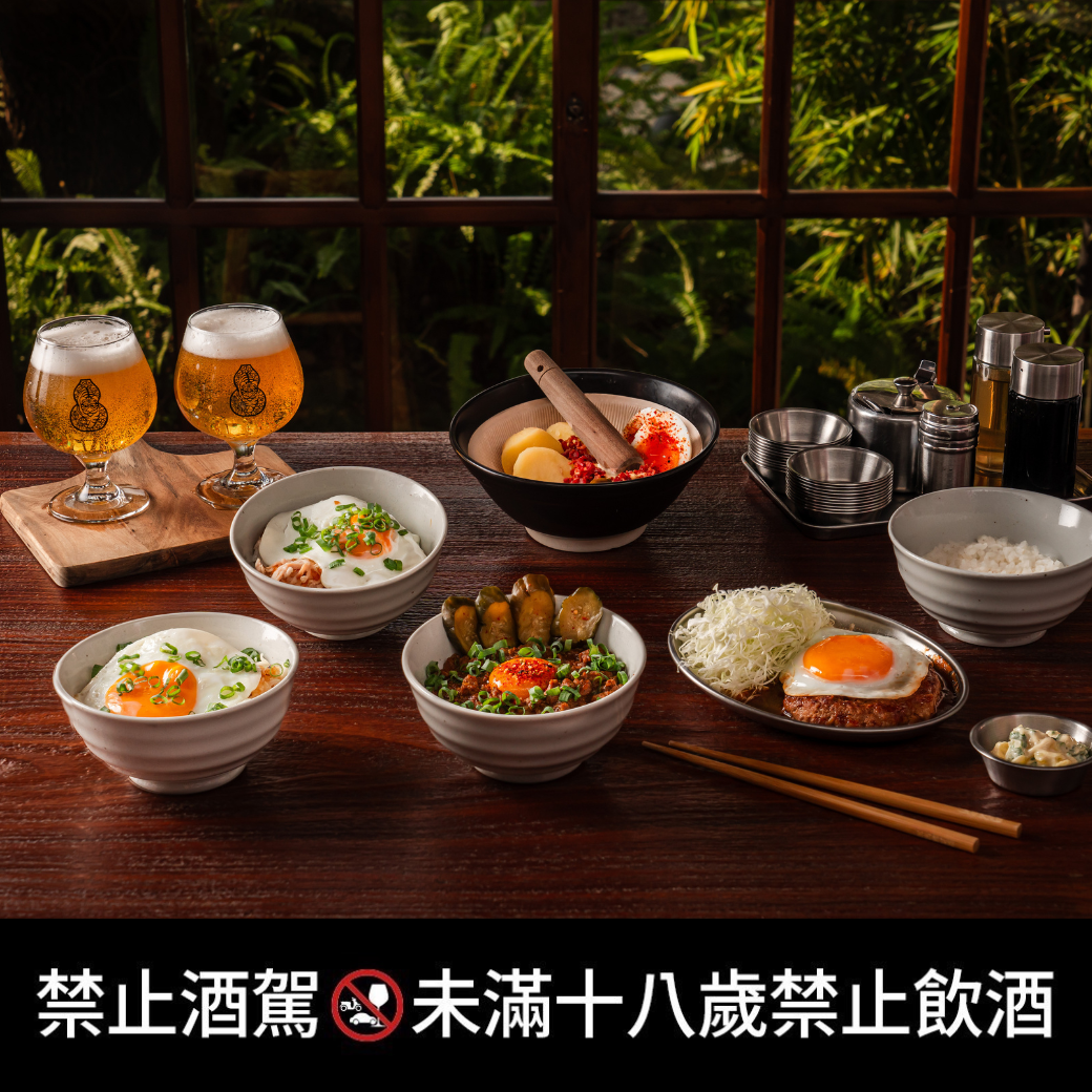 準備好在改建的日式老宿舍與酒友們一同穿越舊時空了嗎?臺虎精釀以日式風格融合居酒屋元素的「臺虎居餃屋」,串連「幸せ蛋祭典」精選主打店內五道經典生蛋料理,搭配精釀啤酒絕對消暑!首推主廚特製日式乾咖哩搭配幸せ鮮蛋的「月見肉末咖喱飯」,吃的時候劃破蛋黃攪拌在一起,口感濃郁恰到好處,搭配酸甜醃菜,超級對味!紅蔥碎與招牌醬汁配上滿滿雞肉絲的「老陳雞肉飯」與酸爽椒麻帶勁「傻瓜乾麵」,兩道復古的台味小吃加上一顆太陽蛋堪稱神級誘惑!當然經典的日式家庭美味「馬鈴薯沙拉」、「漢堡排定食」也都是來到臺虎居餃屋不可錯過的!