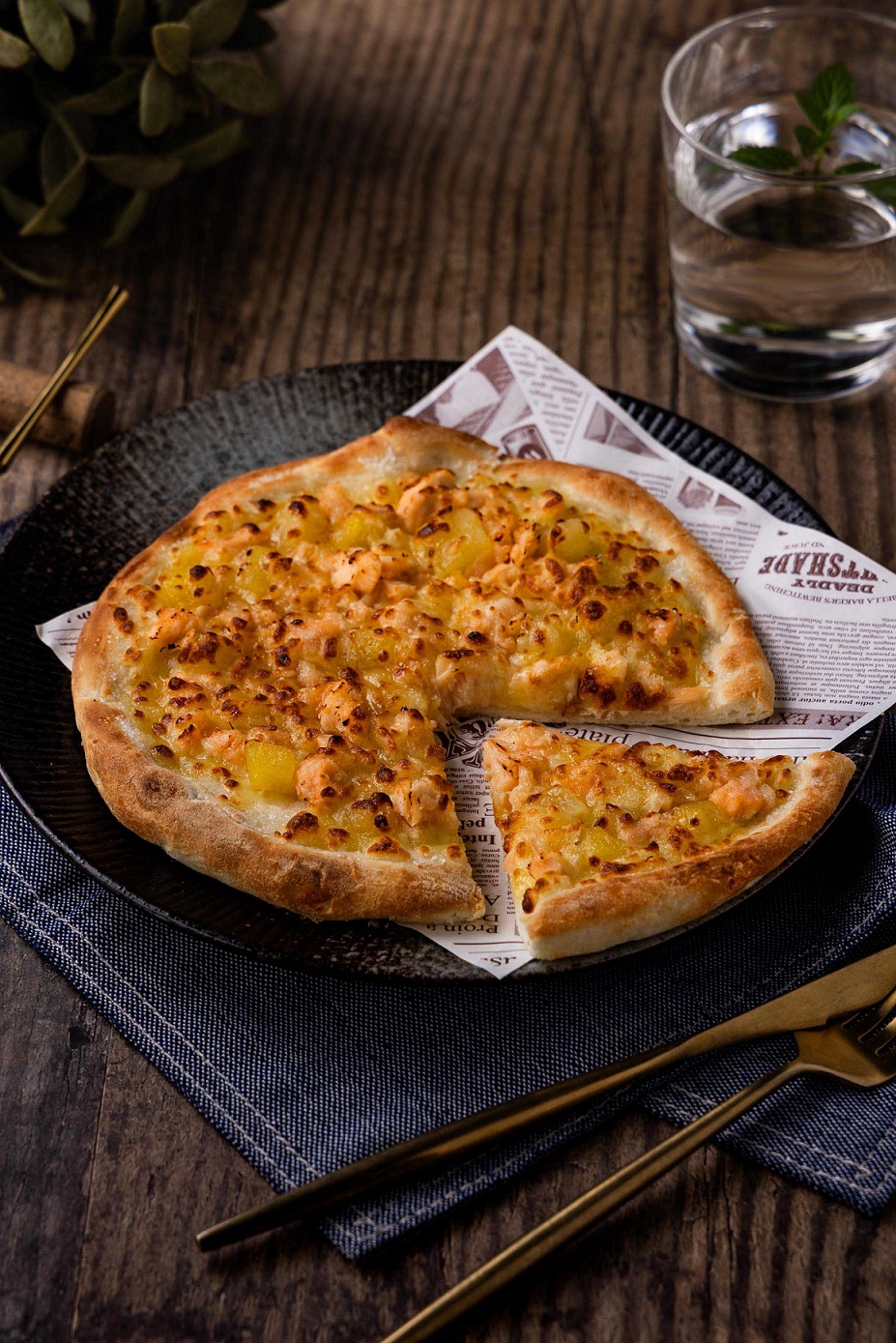 「焦糖鮭蜜披薩」,大口咬下,琥珀色糖衣包裹著鮭魚的綿密脂香(8吋;定價238元)。(圖片來源:美威鮭魚提供)