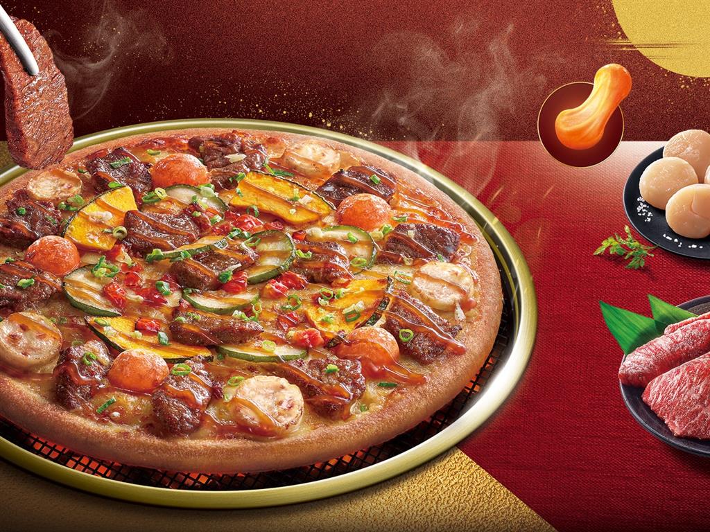 必勝客和台中著名屋馬燒肉合作,推出期間限定口味「月見五盎司菲力比薩」,將燒肉與披薩完美結合,讓民眾享受獨具中秋風味的燒肉披薩!
