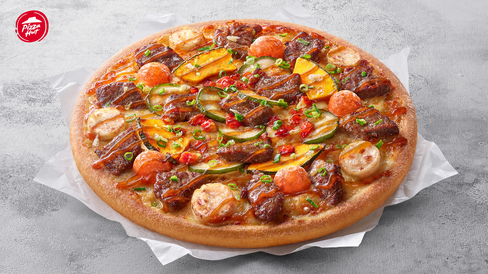 必勝客和「屋馬燒肉」聯名推出「月見五盎司菲力比薩」,結合厚切菲力牛、鮮美彈牙干貝和月見切達白玉,搭配特調果香燒肉醬,完美還原道地日式燒肉風味!(圖片來源:必勝客提供)