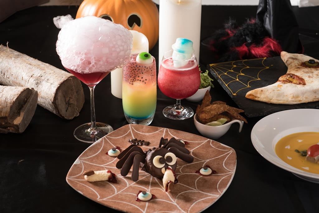大廳酒吧The Lounge精心設計萬聖節驚悚套餐NT$499+10%,首先上菜的是擦著紅色指甲油的手指南瓜湯,主餐為義大利餃化身陰森的月亮幽靈,另有生菜沙拉及烤雞翅,若再加價100元,還享有Q版黑蜘蛛巧克力蛋糕及咖啡或茶,份量十足的搞怪餐。