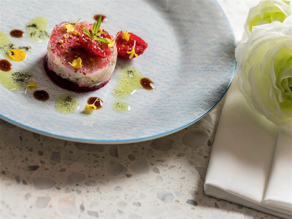 首先北海道干貝/海膽/茴香,以半熟的干貝及海膽帶出海的鮮味,茴香根口感清脆爽口,盛裝在Royal Doulton主廚聯名系列釉面起伏的典雅白平盤感受漫步在沙灘的意象;接著是紐西蘭長螯蝦塔塔/覆盆莓/金合歡子/馬鞭草風味油,清爽的蝦塔塔佐甜菜根,以及風乾的覆盆子堆疊味蕾層次,點綴上豔黃的金合歡子,並利用Royal Doulton北歐復刻系列的粉彩藍調平盤,搭配出純淨淡雅的擺盤藝術。