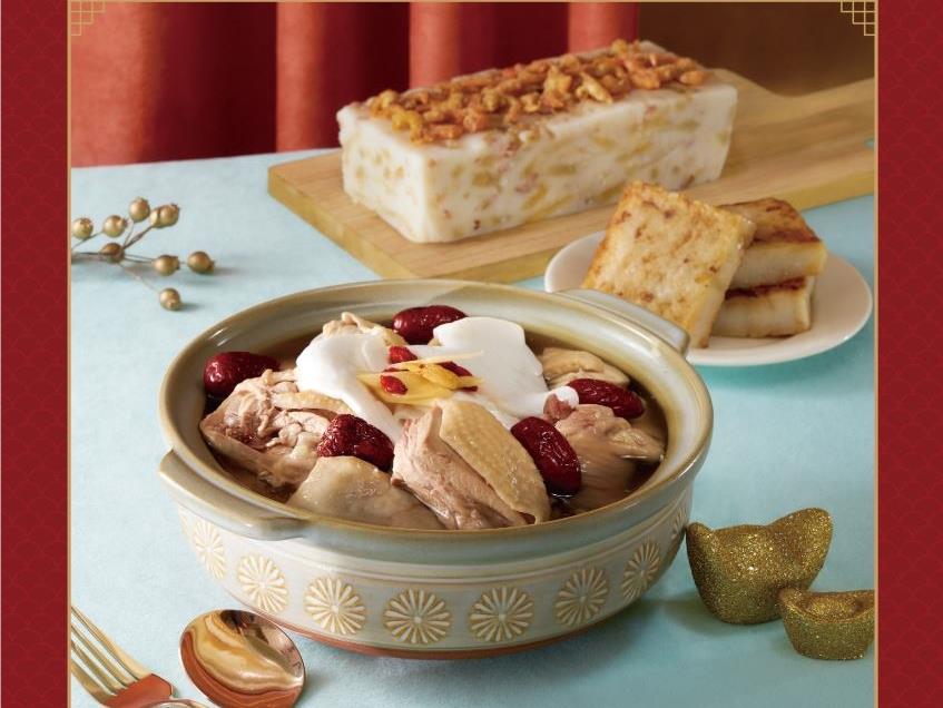 大吉大利好彩頭,售價1128元。椰汁腩排燉雞湯組合加上臘味金蝦港式蘿蔔糕。講究的粵式料理組合,湯品肉質軟嫩,清澈鮮甜,搭配道地的港式蘿蔔糕,一嚐臘腸與清甜蘿蔔絲交織出的鹹香美味,寓有大吉大利好菜頭象徵,為年節增添不少喜氣。