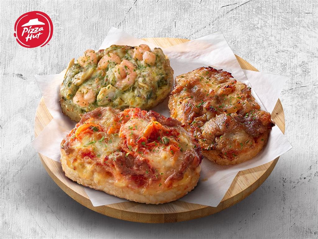 「起司飯圈圈」米飯飽滿且粒粒分明,更能一次嘗到三種新口味:泡菜燒肉、炙烤壽喜牛以及青醬海鮮。(圖片來源:必勝客提供)