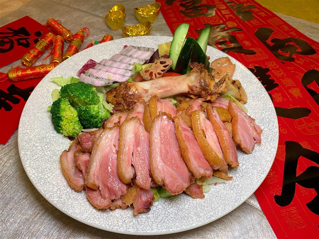 俗稱金元寶的富貴腿,寓意招財進寶,採用五斤重新鮮台灣黑毛豬前腳 ,以獨家中藥材滷製三小時至入味軟嫩,再入熱油將表皮炸至酥香。盤中鋪墊新鮮有機生菜增加口感亦爽口解膩,擺進切片的酥脆豬腳,淋上祕製和風醬,讓富貴腿更加清爽開胃。