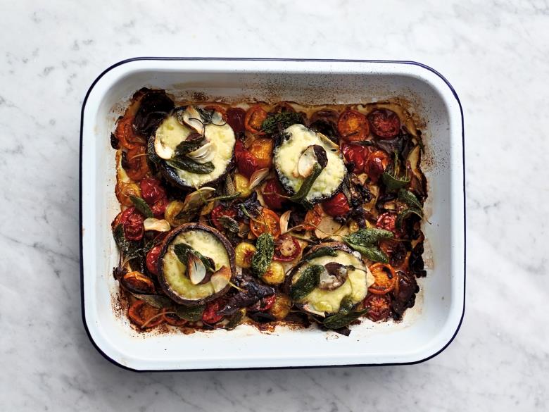 Step 4挑出12片漂亮的蒜片和鼠尾草葉置旁備用,將波特菇傘底朝上置於其他食材之上,送入烤箱烤10分鐘。