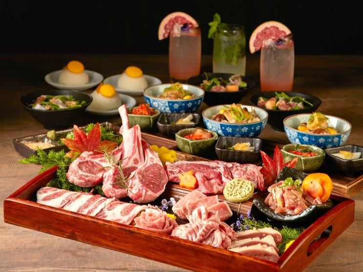 除了豐盛肉品,套餐還搭配應景的中秋限定新菜「月見果香帕瑪火腿」作為開胃菜,鹹香的義大利生火腿搭配鮮甜水果,加上核桃、麵包丁與象徵月圓的蛋黃,鹹甜交織、十分開胃。以及使用柚香醬汁醃漬的「鮭魚下巴柚庵燒」,豐美脂香經燒烤後香氣四溢,入口後在口中繚繞的清雅柚香,都是中秋期間才有的應景滋味。附上草蝦、地瓜洋芋起士燒、乾杯自家製泡菜與飲品。