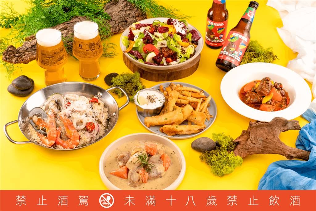 紅寶石般的洛神花搭配清爽開胃的洛神梅子醬享用,與烤蔬菜、烤紅藜麥交織出多變口感;將東台灣代表魚種鬼頭刀炸出酥口輕透麵衣,魚排菲力部位仍保有鮮嫩多汁;團隊還大展創意,把花蓮名產剝皮辣椒製成西式燉飯醬汁,呼應透抽、淡菜、白蝦的鮮甜,讓人食慾大開!佐餐酒也大有來頭,特別選用台東泰源幽谷的無毒野薑花,於啤酒熟成階段冷泡數日緩緩釋放香氣,悠長花香中搖曳薑科植物特有的辛香氣息,溫柔清新彷彿冬日暖陽。