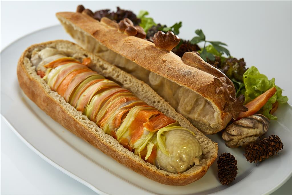 意外地,剛出爐的麵包雞不像雞、更像一條柴薪!黎主廚解釋:「這個造型的靈感來自吃了將帶來一整年幸運的法國聖誕木柴蛋糕Bûche de Noël 。」包覆麵團前主廚已將整隻黑羽土雞去骨、攤平,調味後與大蔥、香菇等蔬菜捲成筒狀,麵團不僅能封存雞汁、保持肉質鮮嫩,最後還能與雞肉一起上桌享用,沒有絲毫浪費。每位客人可品嚐到原味與另行煎香表皮的兩種版本。原味烤雞肉質嫩彈甜美,煎過的雞肉則增添迷人焦香,搭配黑松露雞汁與甜美烤蔬菜,過節儀式感滿溢。