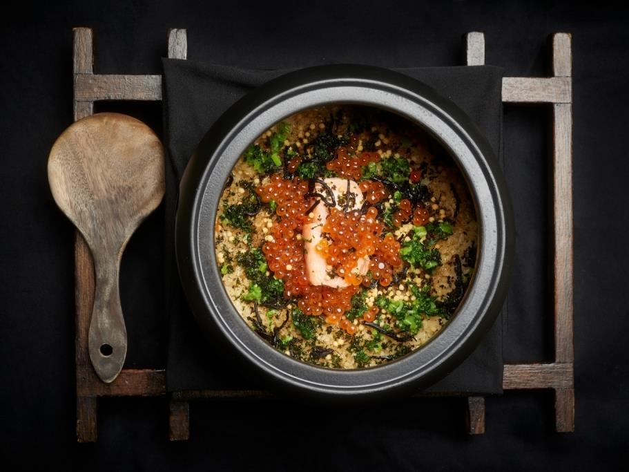 初鰹,象徵春天的來臨。其珍貴性自江戶時代便深受日本饕客喜愛,甚至流傳「寧可典當妻子,也要品嚐春天的鰹魚」的俗諺。「藥味半敲鰹」以半敲燒手法炙燒初鰹,搭配日本料理中的草本辛香藥味,帶出春日獨有的鮮美與草本芳香。「牛舌壽喜燒」則將仙台著名的牛舌料理,以壽喜燒方式呈現,帶來濃厚甘甜的風味層次。「腹子釜飯」以鮭魚與鮭魚卵為主角,承襲宮城縣傳統鄉土料理的精髓,讓每一口米飯都滿溢鮮美滋味。最後,以仙台特產枝豆製成的「枝豆麻糬」,豆香與糯米的柔韌交融,為這場春日盛宴畫下獨特而溫潤的甜美句點。