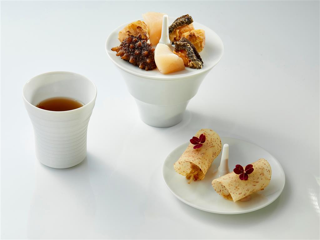 法式佛跳牆因春節氣氛渲染,推出後特別受歡迎,連續數年的冬季套餐都保留下這道,黎主廚表示:「老母雞、豬腳等台式佛跳牆用的食材一樣不少,不過最後我們還是回歸到法式的烹飪技巧,將原本濃濁的湯體澄清,保留佛跳牆濃郁的風味,喝起來卻更加清爽。」今年的版本將芋頭泡泡改成鑲入芋泥、香菇丁、紅蔥酥的風乾芋頭卷,如此可確保湯汁清澈,不會因為芋頭泡泡融化而變濁。深琥珀色的湯汁絲滑醇厚,干貝、鮑魚、栗子、刺參等配料入味鮮爽,精緻的法式作工賦予佛跳牆更清麗典雅的面貌。