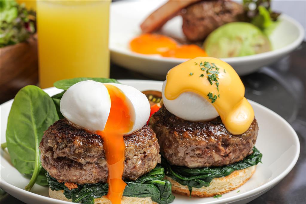 搭配漢堡排蛋料理選用來自花蓮方舟畜牧場的放牧蛋,主廚悉心將良善優質的食材賦與廚藝加值,變化出班尼迪克蛋、放牧太陽蛋、奶油炒蛋、燻鮭魚玉子燒以及番茄起司歐姆蛋等跨菜系料理,無論是美式經典早午餐的擁護者或是喜愛日式料理的親子客都能開心享用。在主餐之外、上庭酒廊也在自助餐檯上擺滿新鮮的小農時蔬,並提供新鮮活力果汁以及希臘優格等選項,要為顧客打造兼具美味和健康的享食空間。