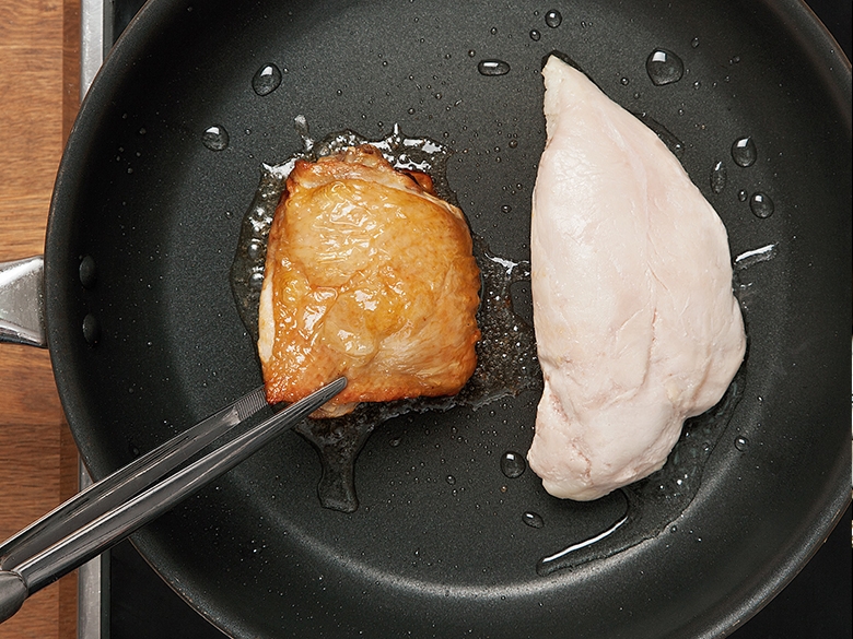 Step 9在大鍋中以中大火把油加熱,雞皮朝下,燒灼至表皮金黃酥脆。時間約2–3 分鐘。