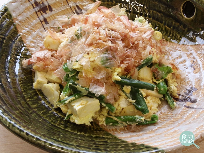 「山苦瓜炒蛋」(ゴーヤーチャンプルー)是沖繩消暑的招牌料理,在台灣的冬季時節,山苦瓜可以青蔬代替、沖繩豆腐則用台灣傳統豆腐「板豆腐」替代。