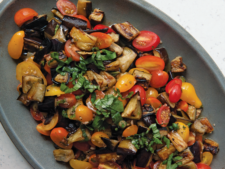 Step 4烤好的茄子放進大碗,加入番茄和羅勒。