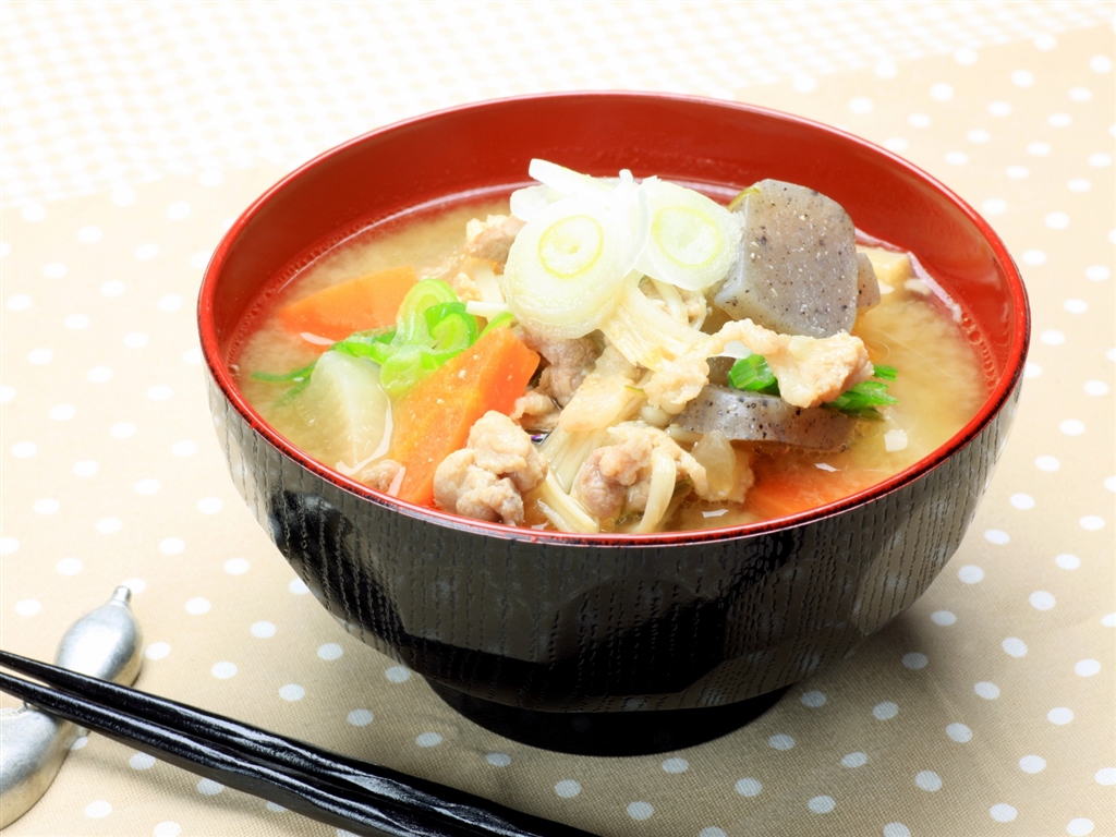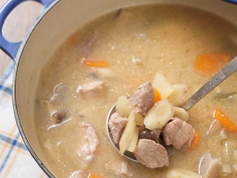 Step 4待白蘿蔔邊緣呈半透明時,先加入信州味噌50g、豬肉塊煮15分鐘,再加入小芋頭以中小火續煮15分鐘。