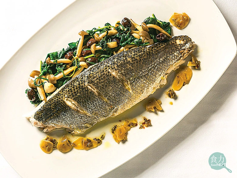 [ 檸檬烤全鱸魚佐蘑菇、菠菜和茴香辣椒醬 4人份主菜 ]