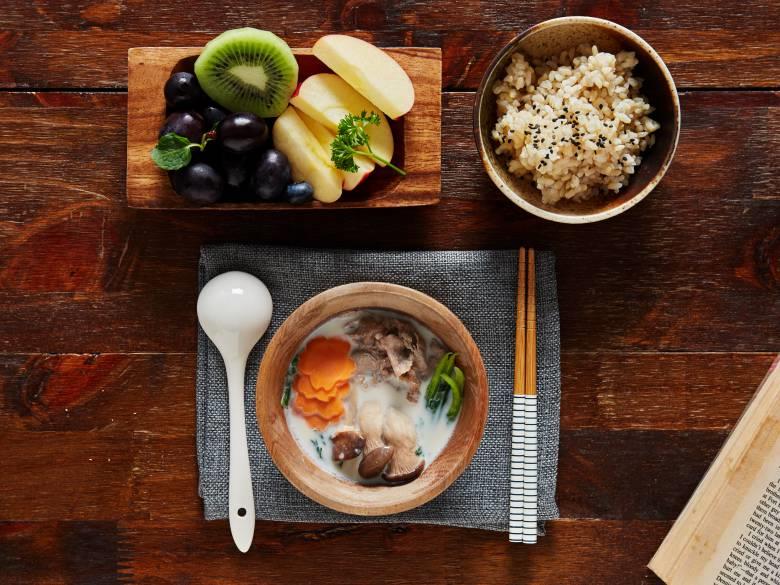 清霜的牛肉蔬菜味噌豆漿煮,再搭配糙米飯與當令水果,就是假日最豐盛的午餐時光。