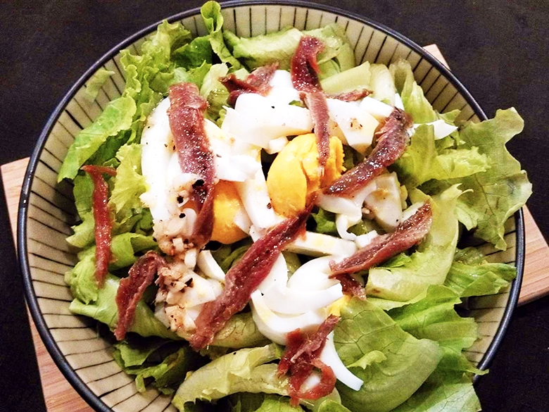 Step 3以生菜和洋蔥絲鋪底,再放上切辦的水煮蛋、鯷魚,再淋上醬汁即可。