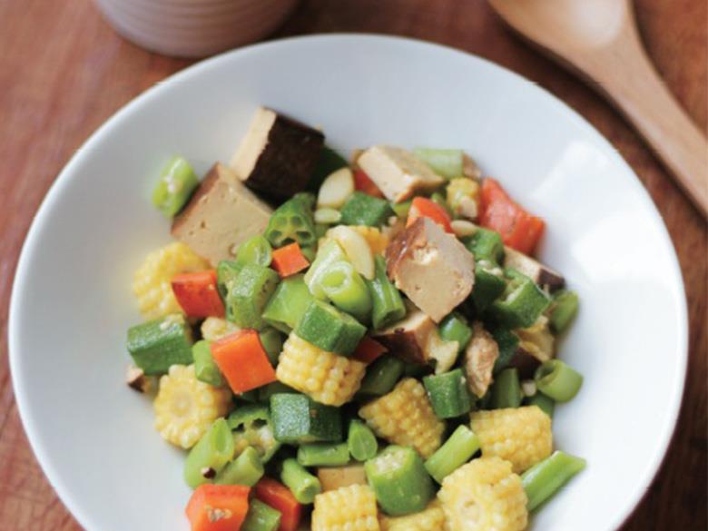 Tips由於亞麻仁油本身的味道較為濃郁,此道料理的玉米筍、四季豆、紅蘿蔔的清甜可以降低普遍對於亞麻仁油難以入口的印象,特別加入了黑豆乾(也可以用毛豆仁、板豆腐)提升植物性蛋白質的含量,只要準備1碗糙米飯或1條蒸地瓜,1份水果,輕鬆煮,均衡吃。