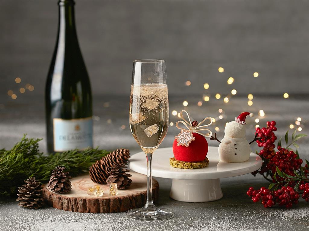 此外,更以經典香檳Delamotte Brut N.V優雅白花氣息揉合柑橘、檸檬以及蜜桃果韻,多次贏得香檳鑑賞家與國際評論推崇,精心打造出讓所有女孩為之瘋狂的「香檳小熊晶凍」,鑲著璀璨金箔的晶透小熊,注入氣泡細緻悠揚的冰涼香檳,微醺滋味慵懶融化於舌尖,蜜香尾韻於鼻息間溫柔綻放,搭配限定香檳甜點「許願紅鈴」或「耶誕雪人」;或可點用Delamotte經典香檳無限暢飲享優惠價1800元加10%服務費,嬌俏演繹法式甜醺午後時光。