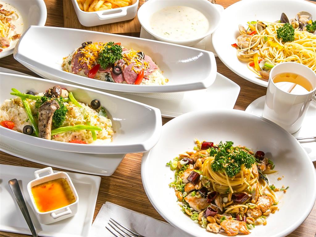 新奇創意的義式料理;傳統與創新的結合,營造出前所未有的獨特氛圍,美妙絕倫的異國美食饗宴。洋城提供五大類義式主餐:義大利麵、香濃焗烤、義式燉飯、薄餅披薩、精緻排餐主餐。義大利麵系列提供:蒜味清炒、奶油乳酪、酸甜茄汁、翠綠蘿勒、泰式紅咖哩、主廚狂想曲,合計6款口味。