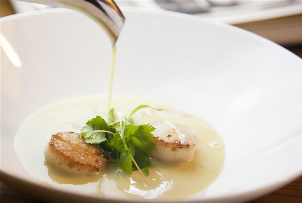 台灣春天的絲瓜甜美,台灣人相當喜歡絲瓜的清甜口味,因此主廚特地選用新鮮台灣絲瓜製成濃湯,湯底將絲瓜打成泥再加入雞湯慢慢燉熬使其濃郁,過程中就可聞到絲瓜的清甜與香氣。搭配日本的百合根泥,以及乾煎的北海道干貝;絲瓜湯品的柔和,生菜的清爽,加上干貝的強烈鮮甜及油質,最後再搭配上炸得酥脆干貝絲及鹹蛋黃,更增添口感層次,整體的搭配,在口中呈現完美結合。