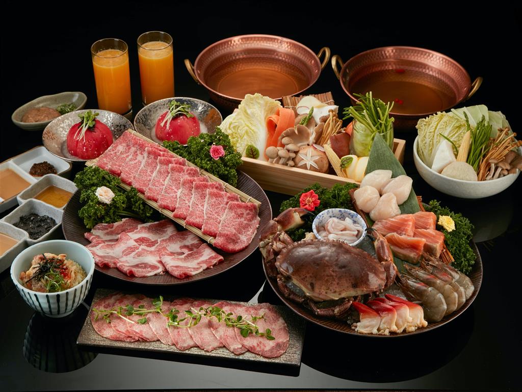 4人套餐不僅享用京都風柚子白味噌鍋,還可一次品嚐到涮涮鍋、水炊鍋、壽喜燒共4種不同風味的日式鍋物,套餐皆附上爽口開胃的乾杯自製泡菜、季節野菜盤、馬茲瑞拉起司、特製手工肉丸、逸品與飲品,十分豐盛。