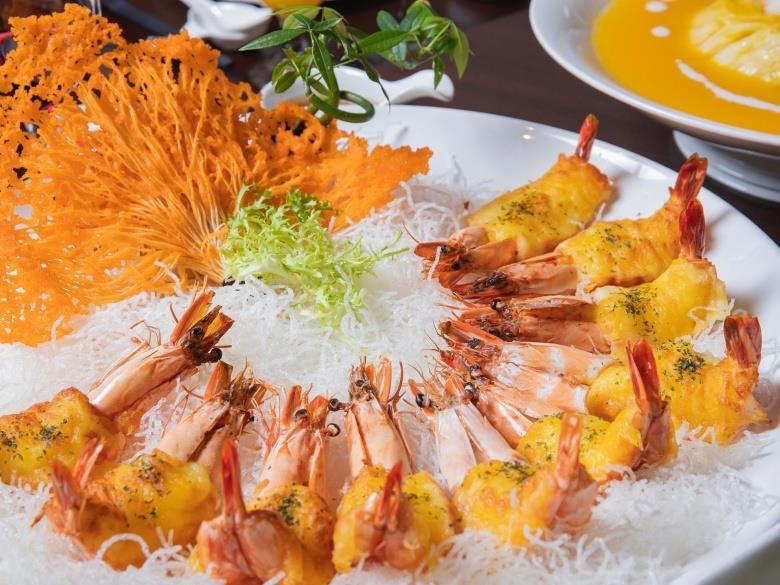 另一款15,000元桌菜,包含富有膠原蛋白及老母雞湯的「養身花膠雞燉盅」;凱撒飯店連鎖董事長最愛也是主廚招牌菜「凱達豬腳佐酸菜」,榮獲今年兩岸十大名菜,豬腳表皮酥脆不油膩、膠質豐富,肉質細嫩可口;主打養顏美容的「紅酒水梨玉帶子」,將水梨以紅酒及火龍果汁燉煮20分鐘,再加入北海道生食級干貝,清爽不油膩的口感頗受女性歡迎;「旭蟹荷香抱珍珠」選用鮮美遠洋旭蟹,配上充滿荷葉香氣的糯米飯,澎湃美味;「焗烤生鮮海大蝦」嚴選富含蛋白質的大草蝦,肉質Q彈鮮美;「金湯海鮮靚芽白」使用栗子南瓜,切塊後加入高湯並以少許鮮奶油打成泥製成,讓濃郁香氣熨至胃裡,舒心暖胃。
