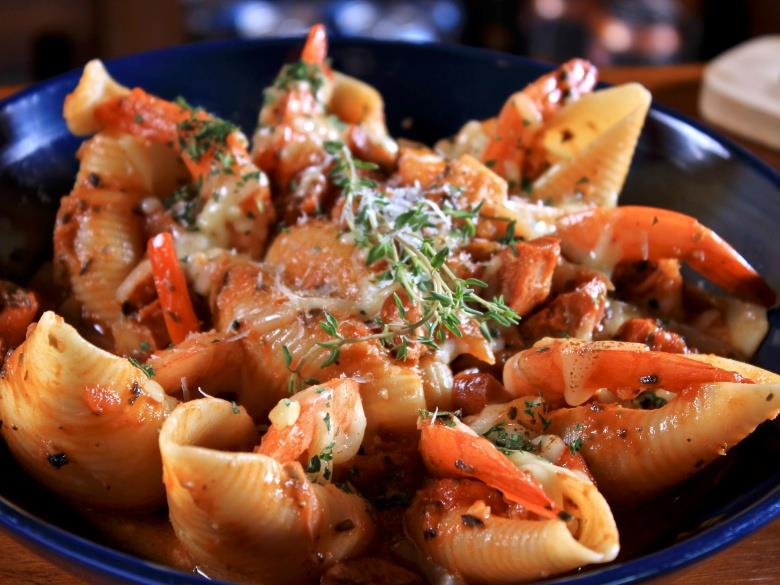 起司鮮蝦大貝殼,在大大的貝殼裡面塞進一隻鮮蝦,填滿餡料,再撒上起司一起焗烤,是一道口感十分玩味的大貝殼義大利麵。
